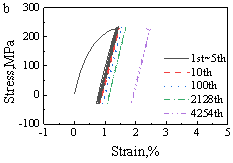 图3挤压AZ31镁合金不同应力水平下的应力-应变响应:(a)平均应力为负;(b)平均应力为正且较高;(c)平均应力为正且较低