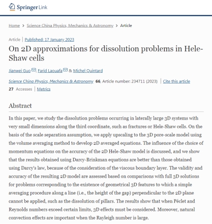 青年教师郭建威作为第一作者和共同通讯作者,与法国国家工业环境与风险研究院Farid Laouafa教授和法国图卢兹大学-法国国家科学研究中心-图卢兹流体力学研究所Michel Quintard教授(国际多孔介质协会主席)在《中国科学:物理学 力学 天文学》英文版(SCIENCE CHINA Physics, Mechanics & Astronomy, SCPMA)合作发表文章“On 2D approximations for dissolution problems in Hele-Shaw cells”。