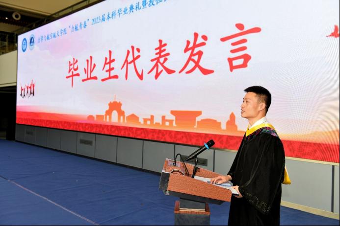 飞行2019-01班班导师胥奇做教师代表发言,回顾了四年以来和同学们的快乐时光,祝福同学们奔赴下一站旅程去实现自己的梦想。
