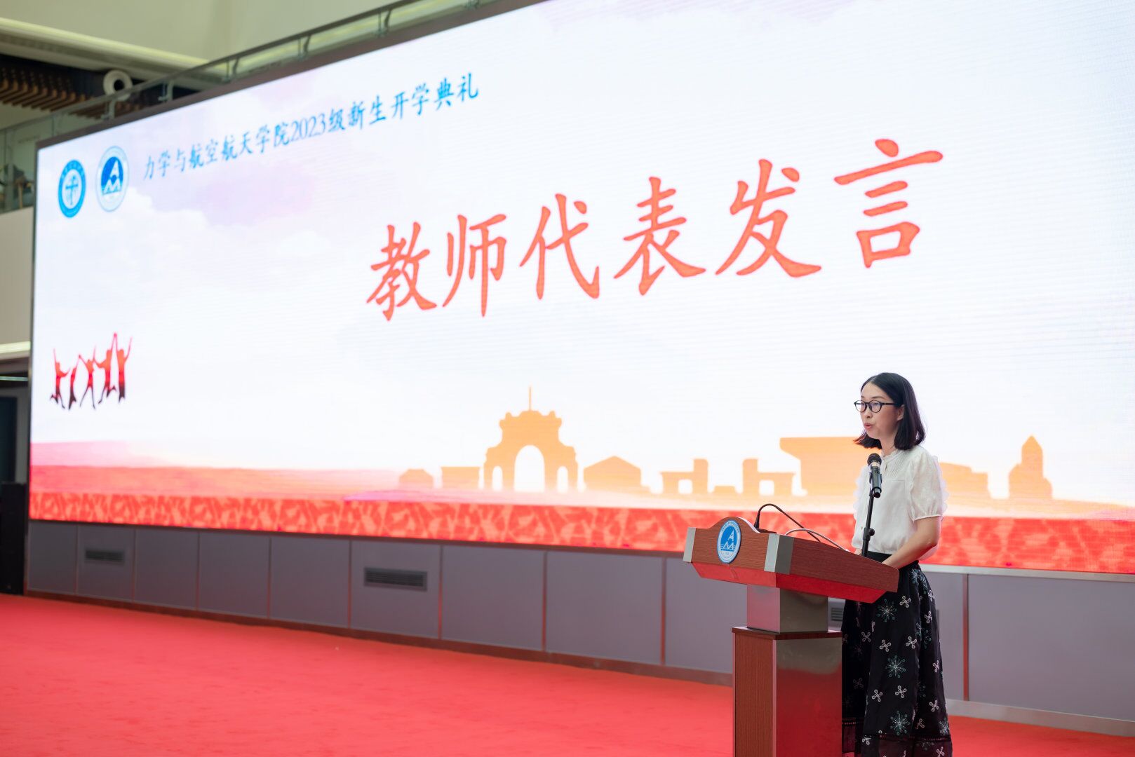在三号教学楼中庭广场召开2023级新生开学典礼。出席本次典礼的有学院党委书记栗民、院长李翔宇、副院长高芳清、阚前华、李鹏、党委副书记孔祥彬、工会主席范晨光、团委书记杨婧、基础力学系系主任鲁丽、工程力学系系主任张娟、航空航天系副系主任胥奇、院长助理刘娟、苗鸿臣、刘虎、王恋舟、专职组织员梁碧波、2023级各班班导师及学工组全体辅导员。参加本次典礼的有2023级全体本科新生、部分研究生新生、家长和学院高年级学生骨干们。典礼由孔祥彬主持。