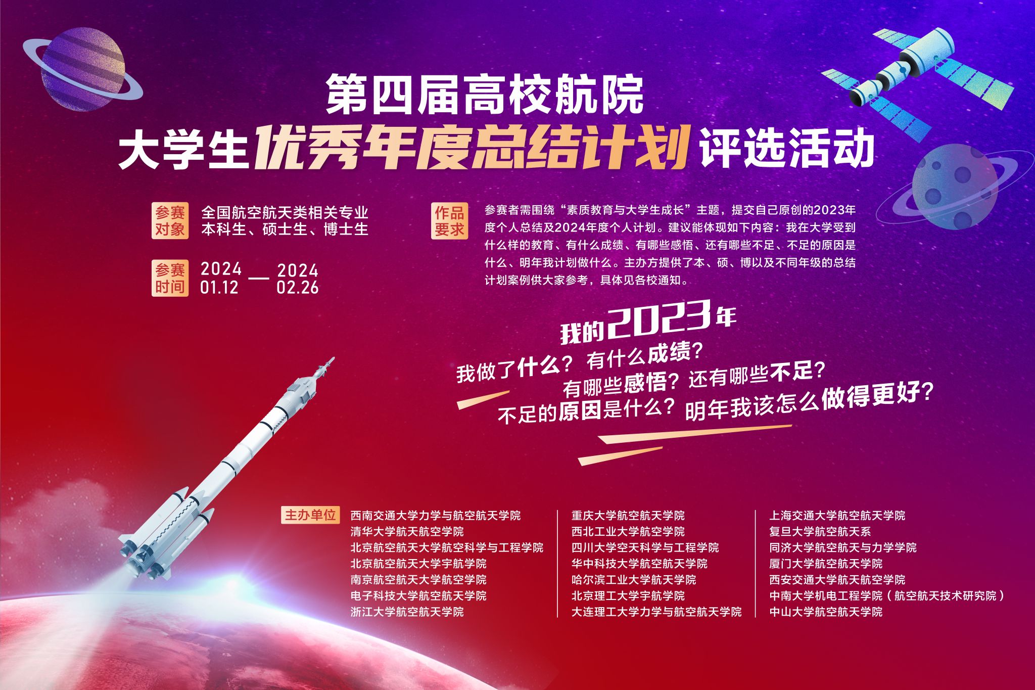 各校先对本校学生作品组织初评(除主办单位外,其他高校航空航天类学院想参与活动的,请联系活动秘书处古老师 028-66366796),各学院推选出不超过5篇作品进入总评(请各校于2024年3月16日前将本校推荐作品汇总后连同汇总表打包发送到[email protected]),由牵头单位组织各校专家及特邀评委联合总评,最终评选出一定比例的优秀年度总结计划,颁发证书及奖品(证书由活动秘书处制作,奖品由各校航院颁发)。