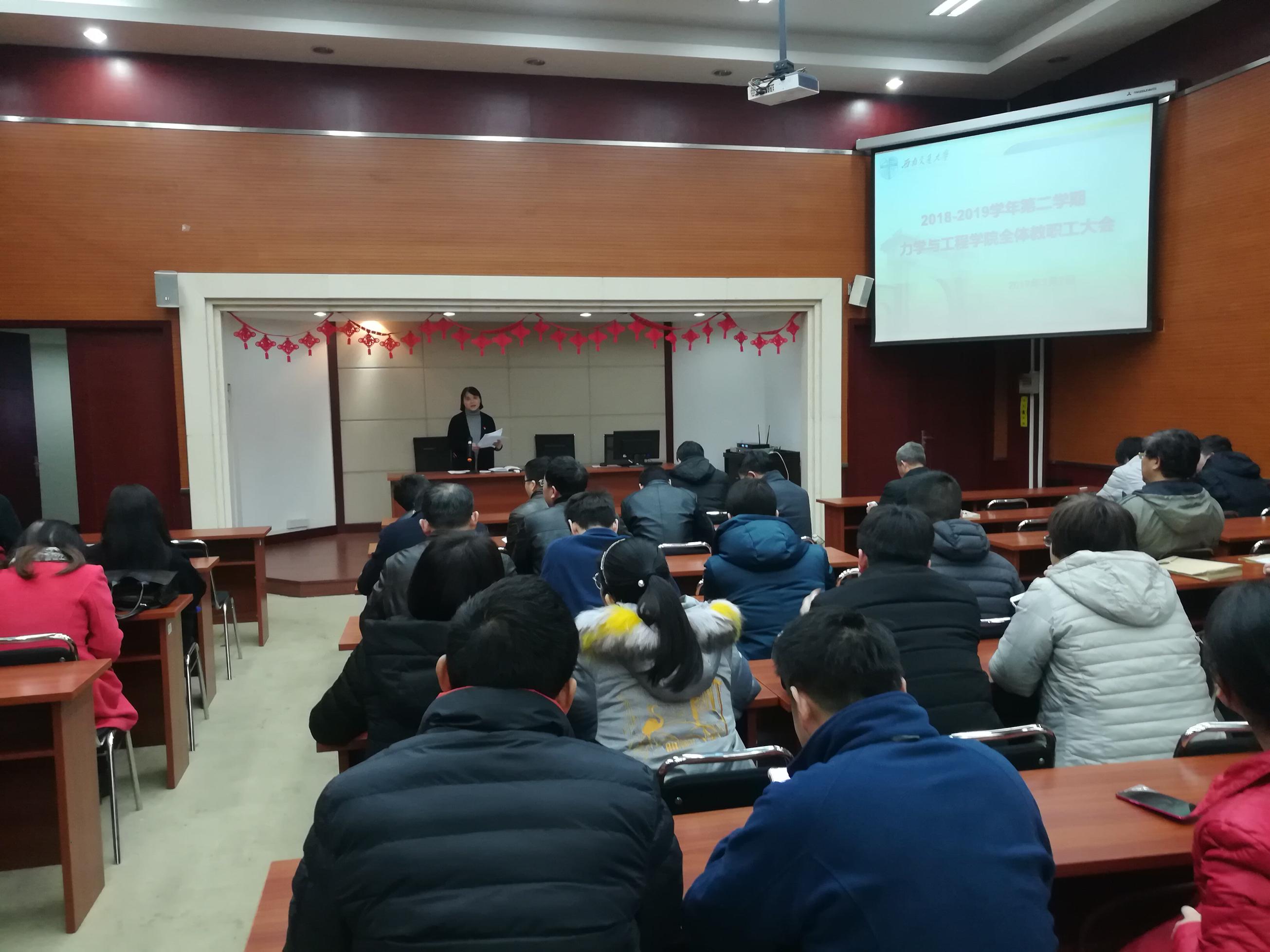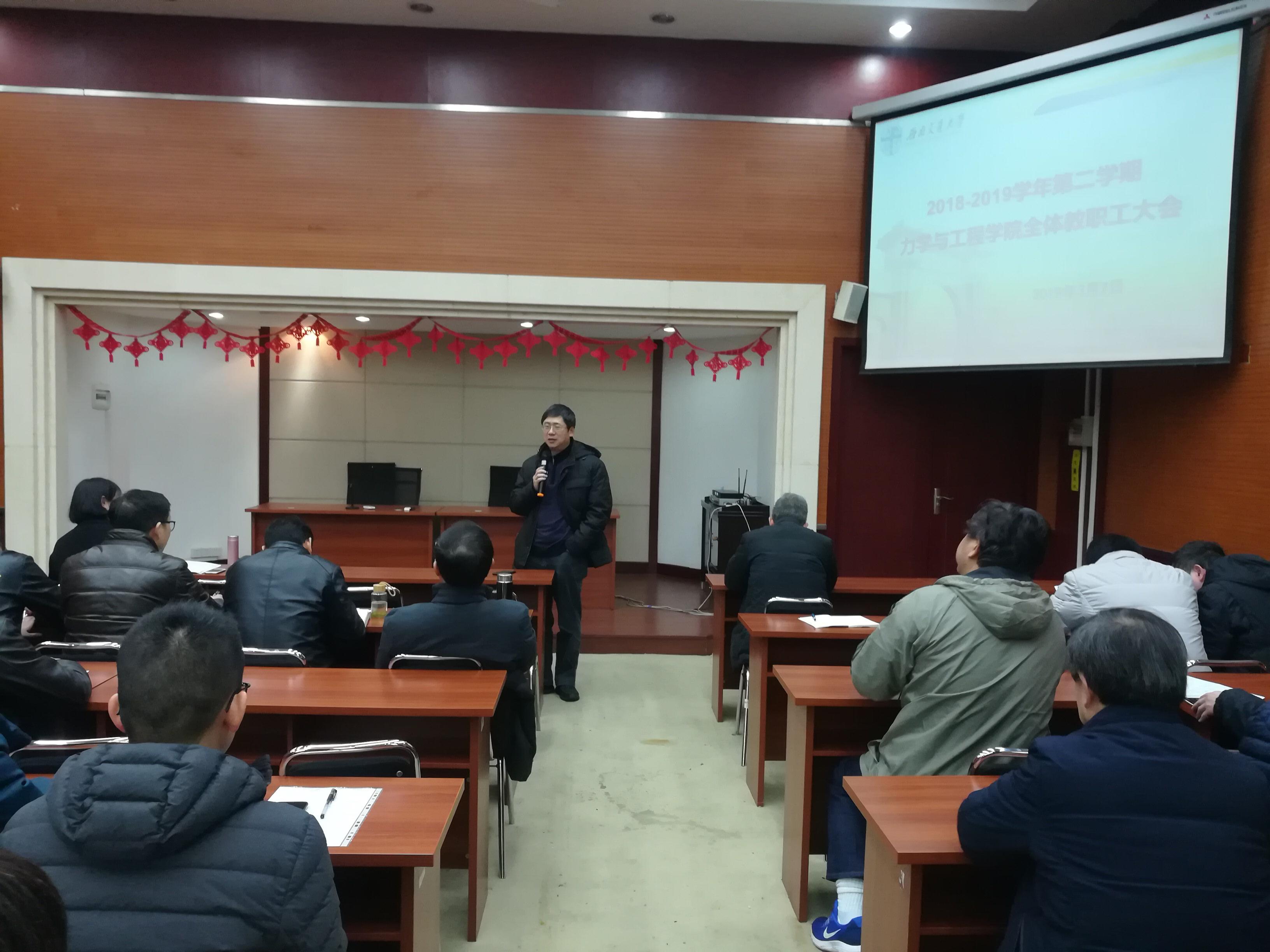 力学与工程学院2018—2019学年第二学期第一次教职工大会于2019年3月7日14:00在九里校区1号综合楼240学术会议厅召开。学院全体教职工参加本次会议。会议由学院党委书记栗民主持。