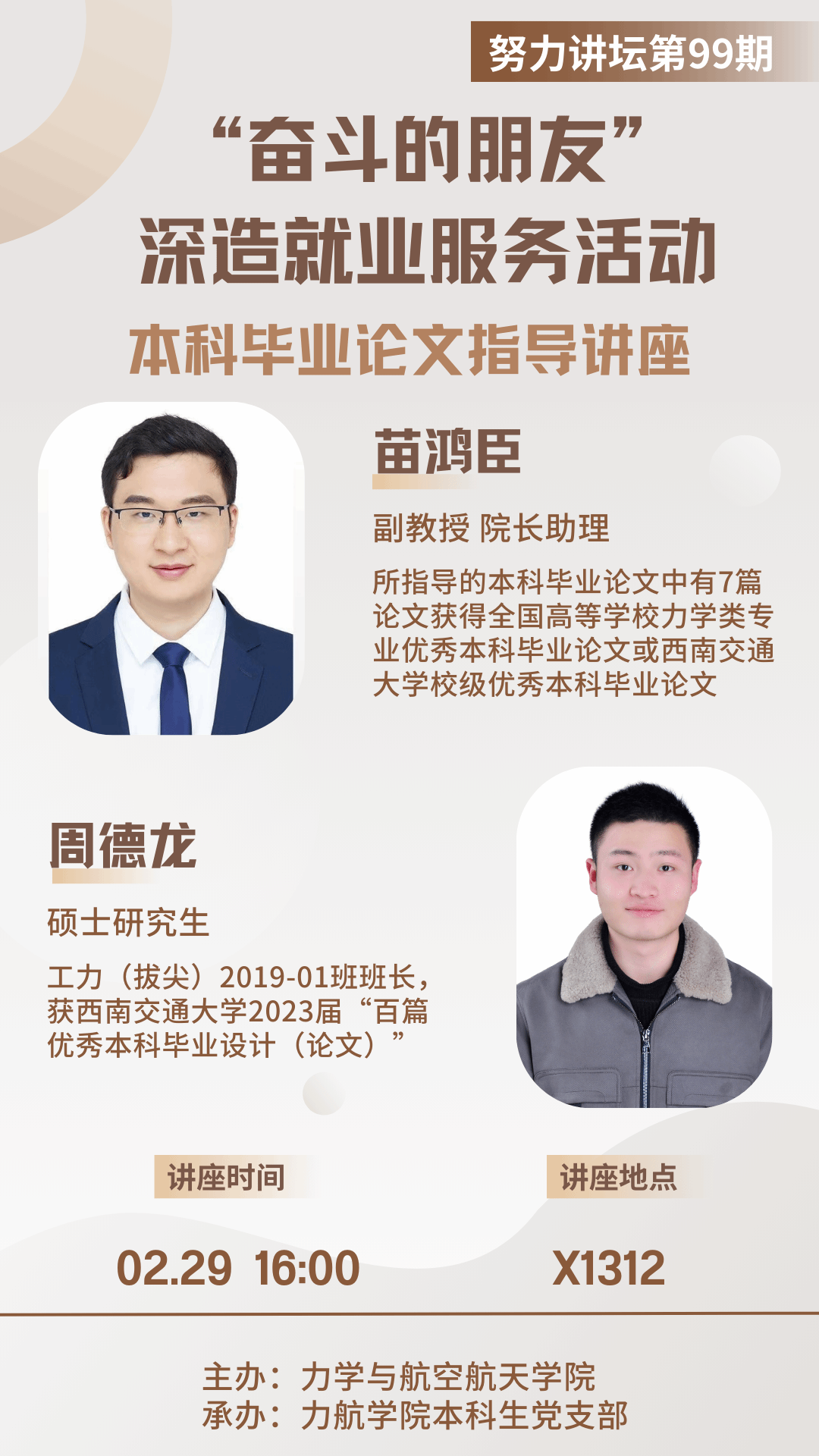 为加强对2024届本科毕业论文的管理,有力推进“奋斗的朋友”深造就业服务活动, 2月29日下午16:00,学院邀请院长助理苗鸿臣副教授、2023届“百篇优秀本科毕业设计(论文)”获得者周德龙同学为泥视频