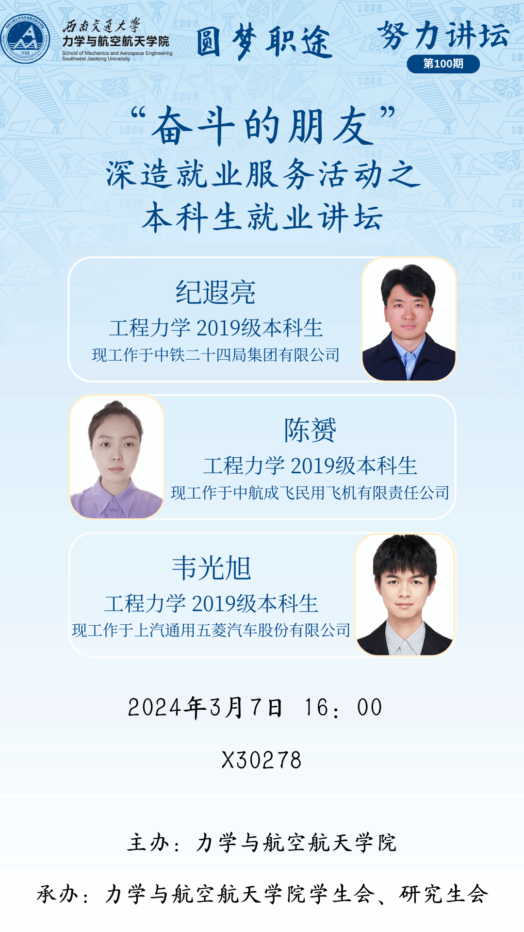2019级优秀毕业生纪遐亮、陈赟、韦光旭开展“奋斗的朋友”深造就业服务活动之本科生就业讲坛,为2020级同学提供多元化的职业指导和经验分享。讲座由辅导员安晟斐主持。