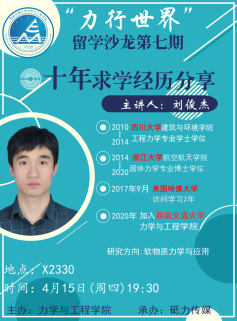 4月15日晚,力学学院“力行世界”留学沙龙活动第7期在犀浦校区X2330教室举办,本次沙龙邀请学院刘俊杰老师担任嘉宾分享自己的求学经历。