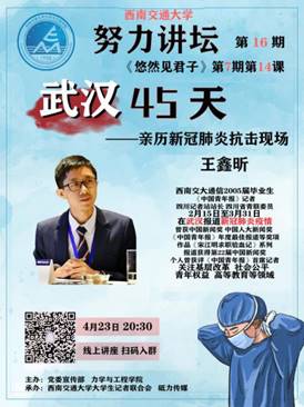 423日晚,《中国青年报》四川记者站站长、我校校友王鑫昕受邀作客“努力讲坛”第十六期,讲述了亲历武汉新冠肺炎抗击现场的45天。本次讲座由党委宣传部、力学与工程学院主办。