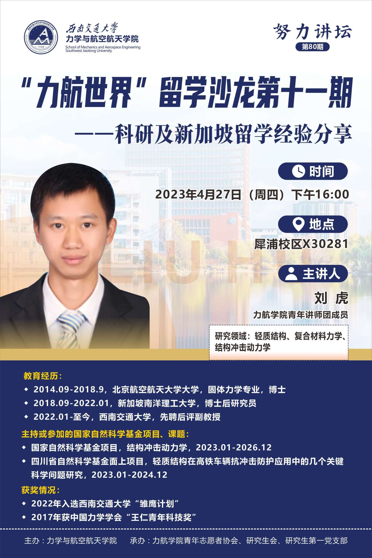 任教。本次活动,刘虎老师以“科研及新加坡留学经验分享”为题,主要从科研心得、留学经验、科研工作等方面进行分享。