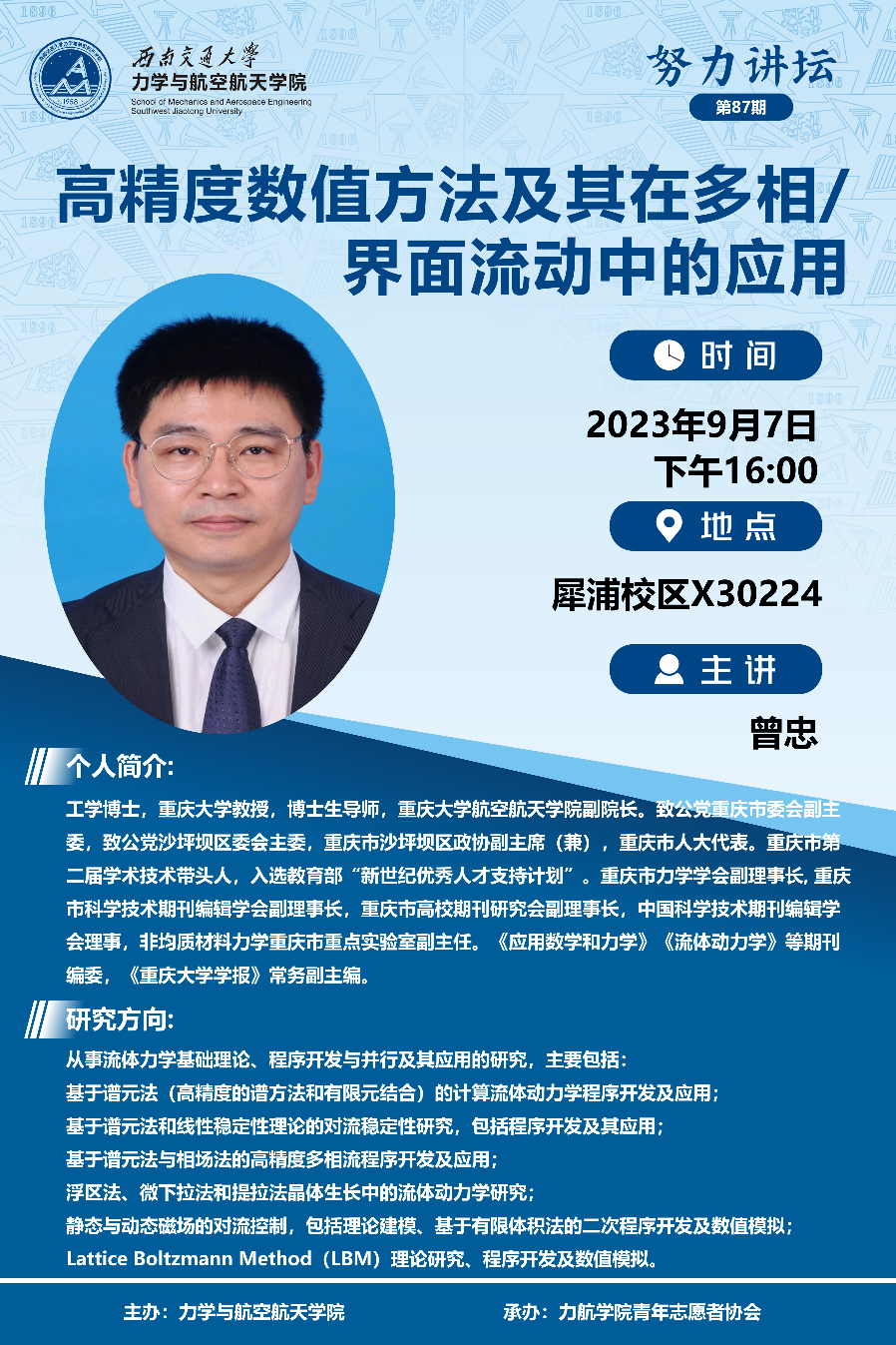 9月7日下午16:00,在X30224,重庆大学航空航天学院副院长曾忠教授以“高精度数值方法及其再多相/界面流动中的应用”为主题为泥视频 学生作了主题报告。泥视频 副院长阚前华、副院长李鹏及学院青年老师们出席报告,学院60余名同学参加本次活动。