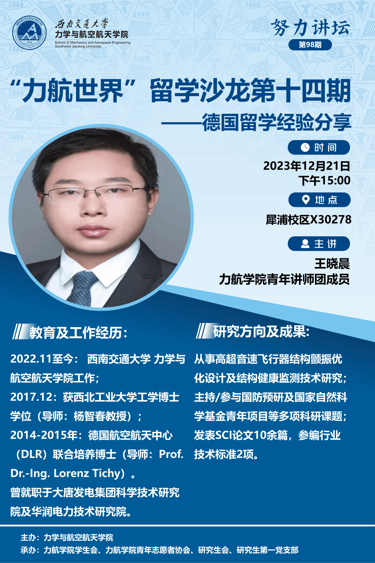 “青年讲师团”成员王晓晨老师为同学们分享他在德国航空航天中心的学习经历和科研经历。辅导员陈蕾及学院10余名同学参加了本次活动。