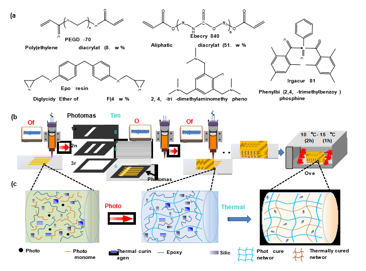 动态光掩模辅助直写打印多材料的示意图,该多材料包含光固化和热固化组分的互穿聚合物网络。(a)打印墨组分的化学结构;(b)多材料的编织过程;(c)打印墨在光固化和热固化作用下的结构演化过程。