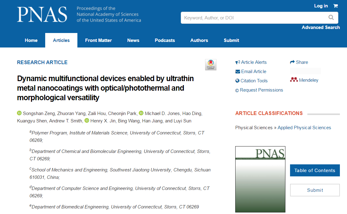蒋晗(Han JIANG)教授课题组与美国康涅迪格大学孙陆逸(LuyiSUN)教授团队合作,以共同通讯作者单位在四大名刊(Nature、Science、Cell、PNAS)之一的《PNAS(美国科学院院刊)》上发表题为“Dynamic multifunctional devices enabled by ultrathin metal nanocoating with optical/photothermal and morphological versatility(PNAS 2022 Vol. 119 No. 4 e2118991119)”的论文,报道了基于性能和形貌可调的金属纳米涂层的多功能器件的最新研究进展。文章第一作者为康涅迪格大学曾嵩山(Songshan ZENG)博士,我校博士研究生杨卓然(Zhuoran YANG)为第二作者,通讯作者为孙陆逸教授和蒋晗教授。