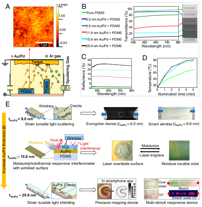 图1Au/Pd纳米涂层的表征和设计器件的原理图:(A)Au/Pd纳米涂层在PDMS(聚二甲基硅氧烷)表面沉积的原子力显微镜图像和金属纳米涂层在PDMS表面上的溅射镀膜的原理图;不同厚度的Au/Pd纳米涂层沉积在PDMS相应的(B)透光率、(C)反射率和(D)光热性能;(E)三种动态刺激响应智能材料器件设计的示意图。