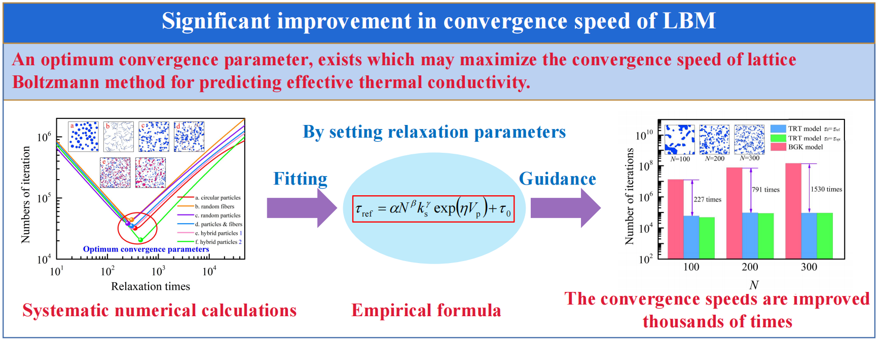 为了解决这一棘手的问题,李翔宇教授团队创新性地采用了更加先进的双松弛时间碰撞算子模型来替代传统算法中的单松弛时间碰撞算子模型。通过系统的数值实验,发现算法中存在一个最佳收敛参数。在确保计算精度的前提下,能够使得算法的收敛速度提升两到三个数量级。经充分验证该算法的正确性和最佳收敛参数的存在性后,提出了一个经验公式方便用于指导热LBM中松弛时间的选择。