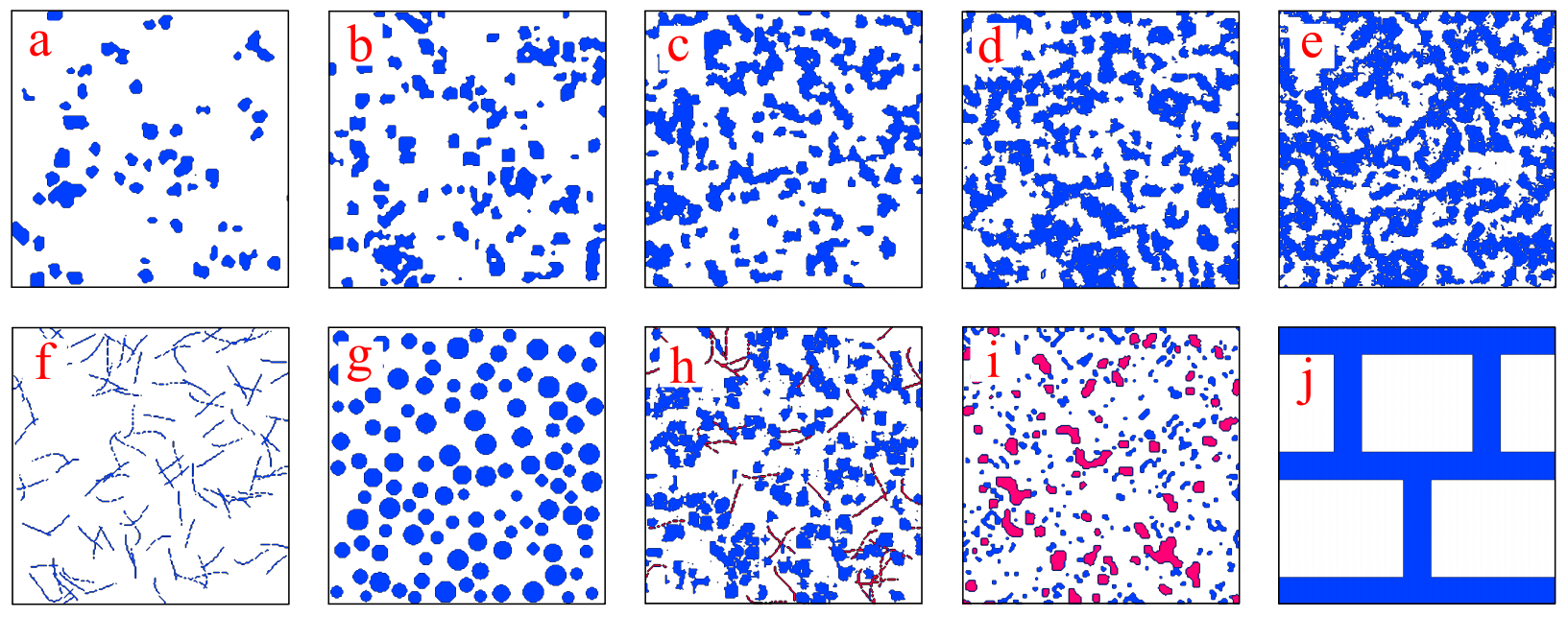图2 部分多相复合材料的微结构数字模型。(a)-(e)为5个不同体积分数的随机介质;(f)-(j)为5种不同分布的复合材料微结构