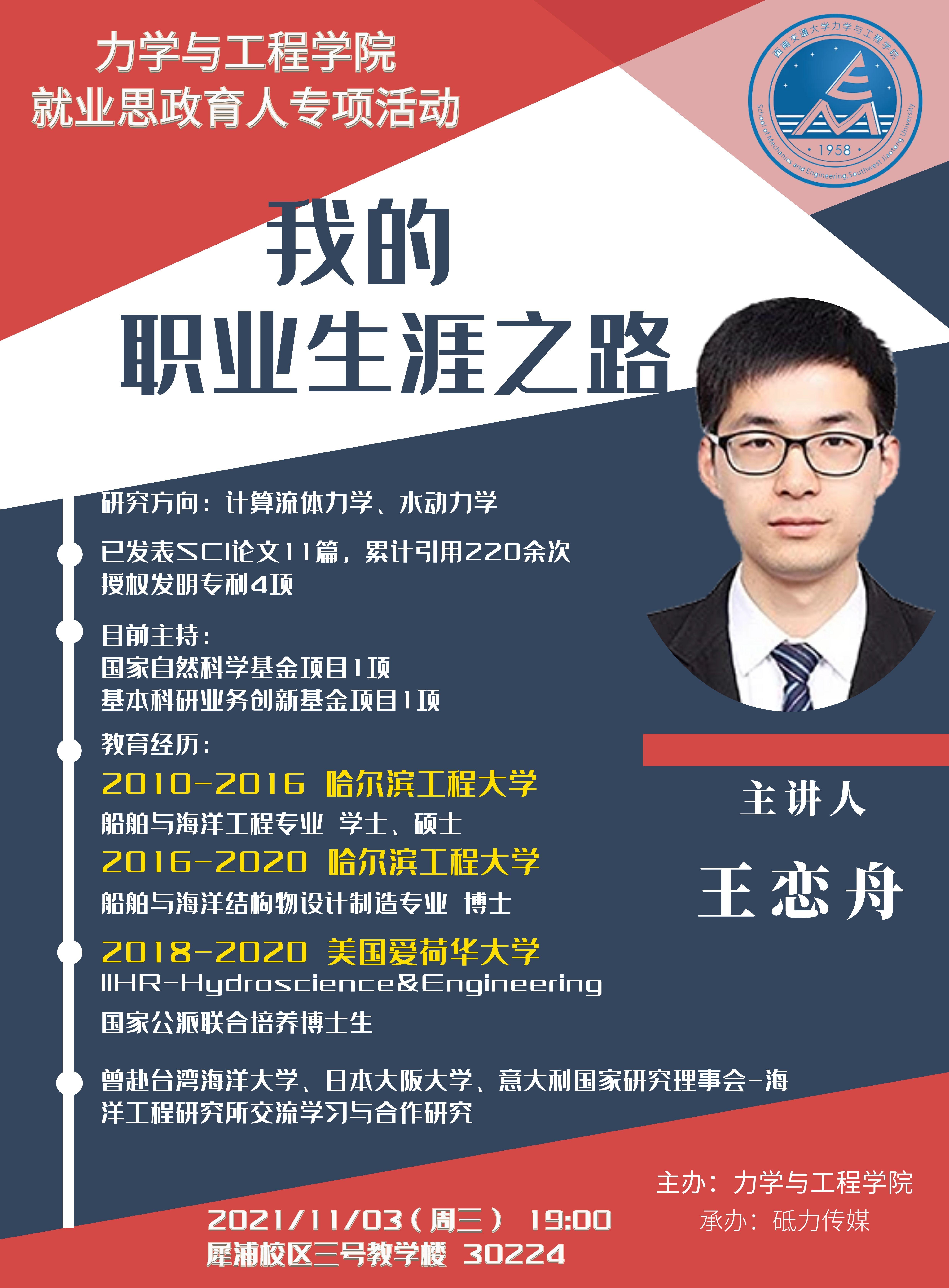 就业思政育人专项活动“我的职业生涯之路”沙龙在犀浦校区X30224会议室举办。本次沙龙邀请学院青年教师王恋舟老师担任主讲嘉宾,为同学们分享了自己的生涯之路。学院研究生和本科各年级同学参加了本次活动。