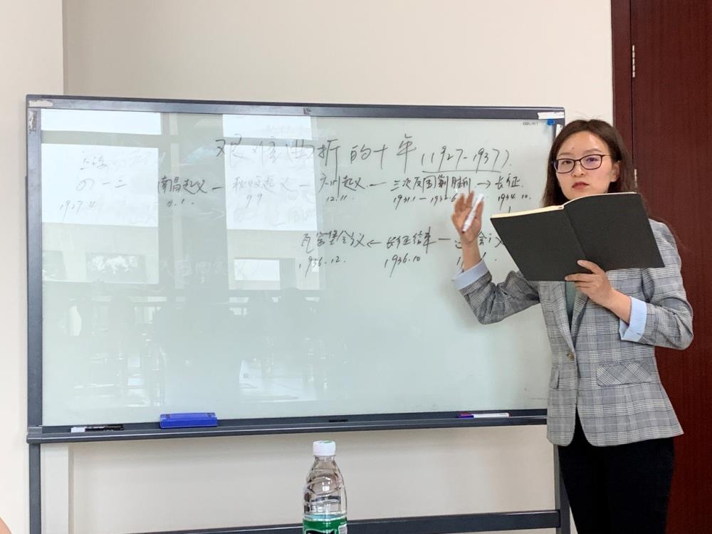 邓思然对1927—1937年间的党史大事件做了详细的梳理。她讲到,这十年被称作是中国共产党人历史上走过的最艰难曲折的十年。邓思然以时间轴为主线向大家一一讲述了历史上著名的“四一二”反革命政变,以及南昌起义、秋收起义、广州起义这三大起义的起因、经过,并对其历史意义作了详细的阐述。此外,还从“土地革命”的背景出发,围绕“土地革命”的内容及意义,介绍了红军反围剿胜利的根本原因,总结了历史经验带给我们的启迪。