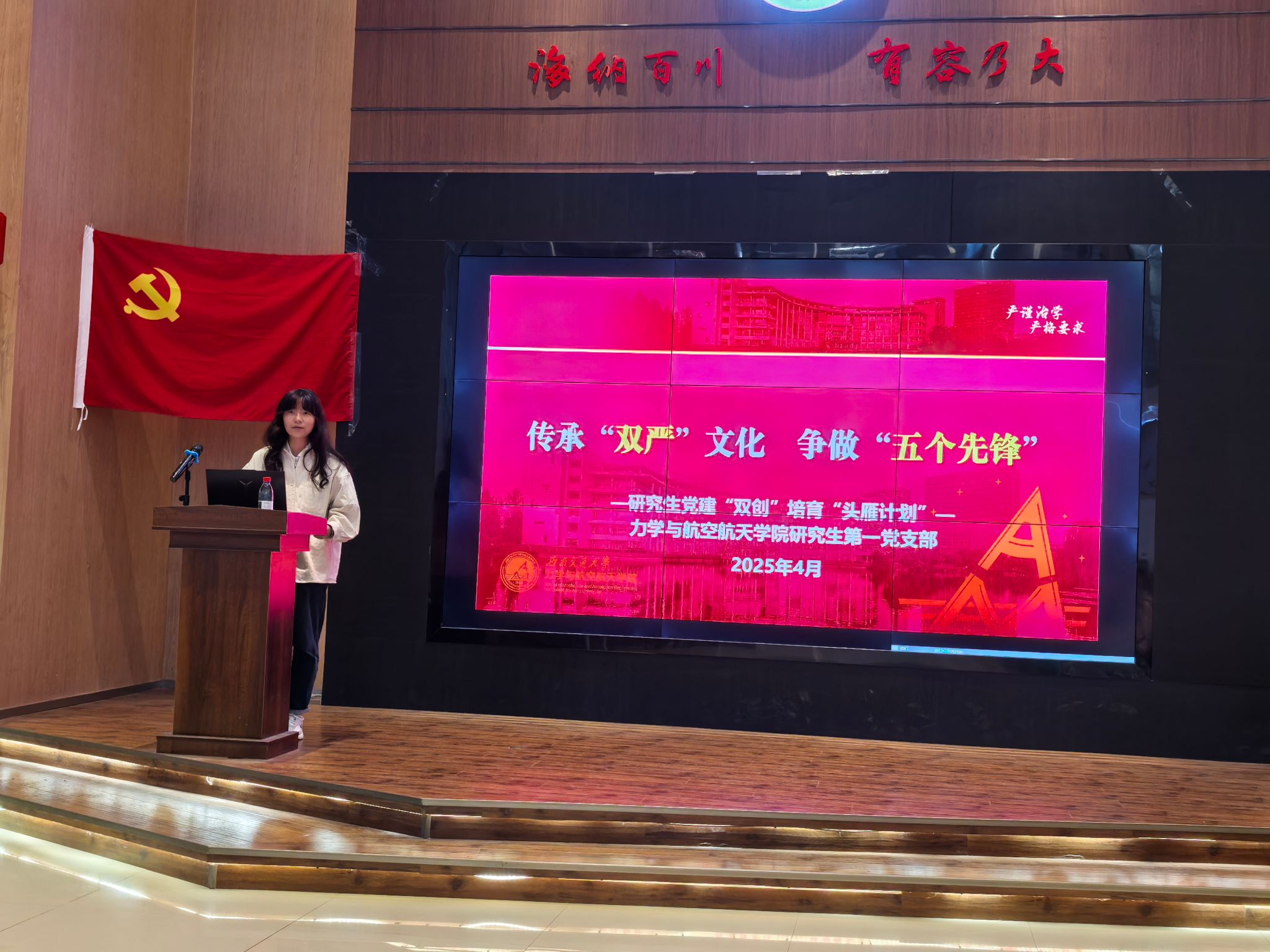 研究生第一党支部书记胡冰晖同志以 “传承双严文化,争做五个先锋” 为题进行报告,详细介绍了支部作为头雁团队在党建工作中的特色做法与建设经验。支部依托课题组进行纵向建设,这种创新的组织架构打破了传统横向支部设置壁垒,实现了党建与科研深度融合,吸引了其他院校的广泛关注与深入讨论。