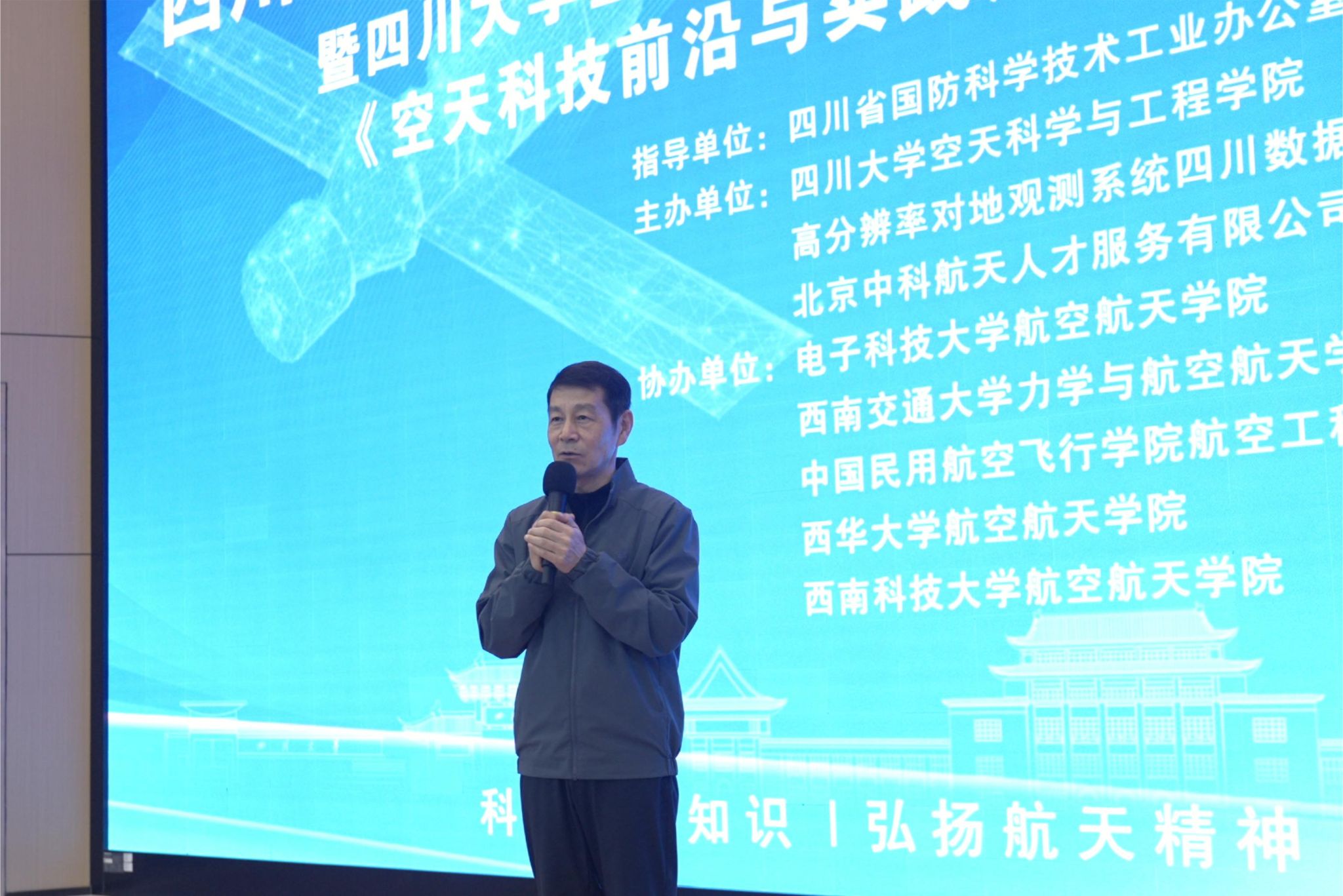 活动第一项邀请了我国首批航天员赵传东,在四川大学江安校区报告厅为来自四川大学、电子科技大学、西南南交通大学、中国民航飞行学院、西华大学、西南科技大学等高校的 400 余名师生带来了一场主题为 “星空浩瀚,探索无限” 的专题报告,现场气氛热烈,反响强烈。赵传东以专业视角,系统梳理我国载人航天工程发展脉络。通过严谨的学术阐释,全面回顾自工程立项以来,我国航天事业从基础建设到技术突破、从追赶跨越到引领发展的完整历程。报告以详实的历史数据与典型案例为支撑,深度解析航天科技工作者在关键技术攻关、重大工程实施中的创新实践,生动展现我国航天事业发展进程中攻坚克难、自主创新的奋斗图景。