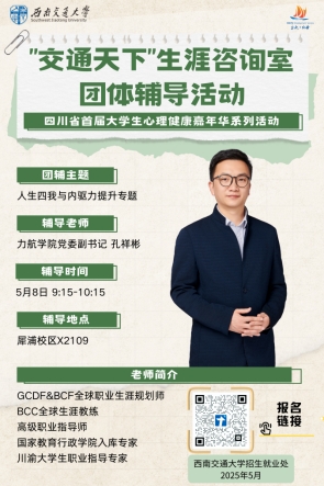 作为本次嘉年华两场团体辅导工作坊之一,“人生四我与内驱力提升”团体辅导活动在犀浦校区X2109教室举行。本次工作坊由四川省大学生职业生涯咨询特色工作室“交通天下”生涯咨询室和泥视频