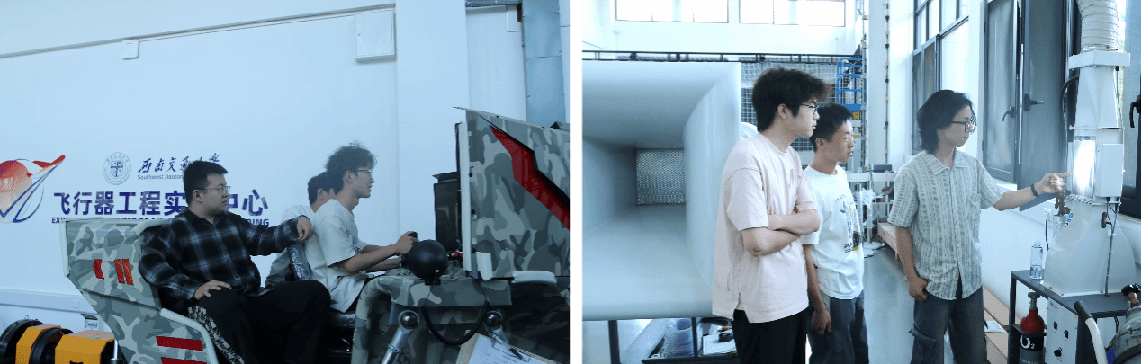 的飞行器工程试验中心。活动邀请了力航文化大使团的同学带领大家了解试验中心,并指导操作六自由度飞行模拟驾驶器,复现飞行状态与环境。同学们沉浸式体验飞行操控,既感受航空科技魅力,又加深了对航空文化与专业科研场景的认知。