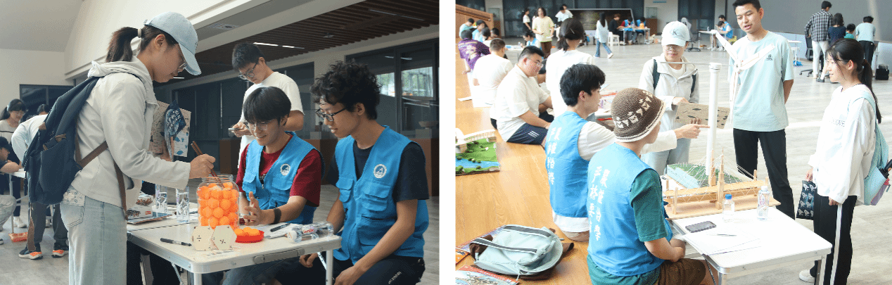 在第一个互动区域,同学们通过参与融入力学基本知识的小游戏、模型讲解和问答活动,深入领略力学知识在日常生活中的实际应用。在 “夹乒乓小游戏” 互动区,同学们手持筷子夹取乒乓球,在这个简单却有趣的过程中,真切感受到滚动和摩擦的力学原理。而在 “叠叠乐” 互动区,大家在抽动积木时,巧妙地控制力的大小和方向,体会积木间的力学结构关系。