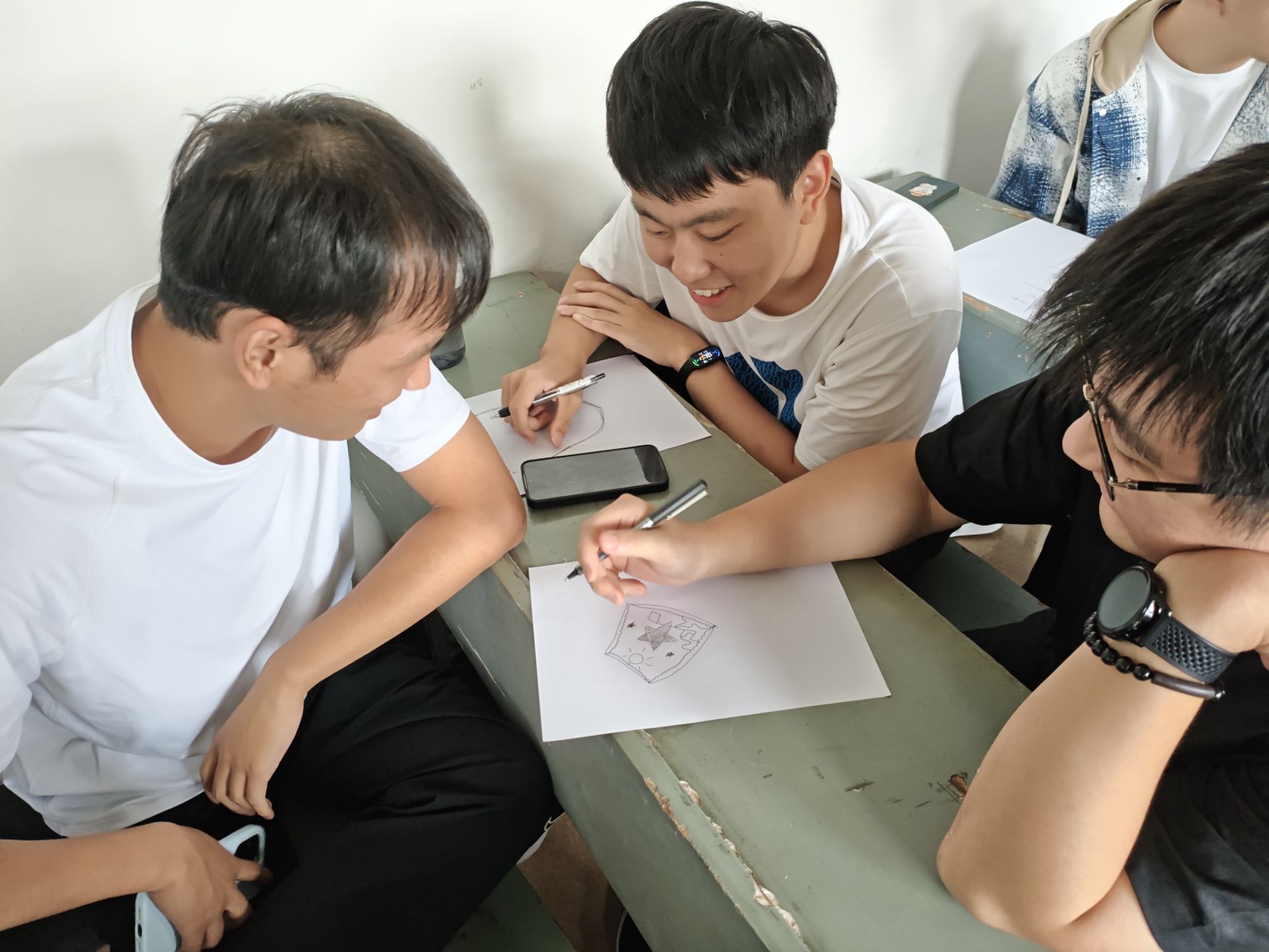 赵老师的沙龙特别设计了绘画环节,让同学们先画一个“盾牌”(寓意个人的内在力量),再将心中的近期目标具象化画入盾牌中。同学们积极参与,有的画电脑键盘鼠标(寓意努力科研),有的画健身器材(寓意好好生活)。