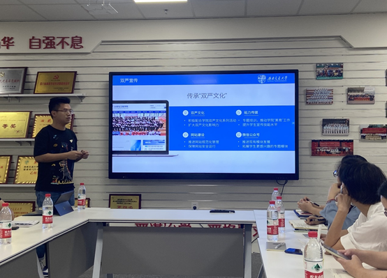 周子涵老师做了题为“双严文化宣传2.0版升级方案与砥力科创营建设2.0版升级方案的汇报。他指出,“双严”精神要通过不断宣传教育内化进学生们心中,同时也要外显于学生们行动中。下一步将继续加强文化宣传以及科创营组织,将“双严”传统在新时代力学学子身上不断彰显。