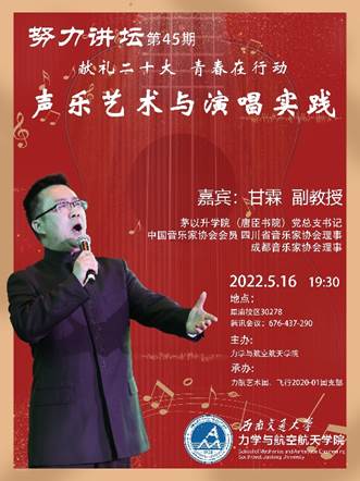 5月16日19:30,茅以升学院(唐臣书院)党总支书记甘霖老师受邀做客“努力讲坛”第45期,讲座主题为“声乐艺术与演唱实践”。本次讲座由力航艺术团、飞行2020-01团支部承办,采用线下与线上直播同时进行的方式。泥视频