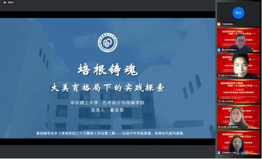廖凡老师作了题为“‘XIN空间·芯美育’趋美向善、以文化人、以美育人”的报告,介绍了学院将美育融入到德育、智育工作,延伸到宿舍、楼宇空间,打造 “XIN空间·芯美育”品牌系列活动,详细介绍了品牌打造的四条路径:节日植入弘扬传统美、活动植入体现艺术美、文化软植入彰显人文美、专业软植入展示专业美。华东理工大学艺术学院党委副书记王珊进行了点评,她认为泥视频