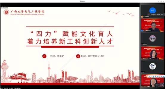 天津大学任怡璇老师作了题为“思政引领、以文化人、努力培养堪当民族复兴重任的时代新人”的报告,介绍了学校围绕“立德树人”的根本任务,秉承“兴学强国”的办学使命,构建的具有学校特色的思想政治工作体系、“三全五育”育人大厦和具有文化积淀的通识教育体系,同时分享了“红叶诗墙”、周末音乐会、讲好天大故事等各类具体特色的实践活动。广西大学电气学院党委副书记雷圆媛做了点评,她对天津大学的思政育人顶层设计做出了高度评价,认为其做到了党建工作、思政教育、通识教育和课外实践的完全一体化,理论体系完整、实践运用丰富,是可示范的高校思政育人、文化育人经典案例。